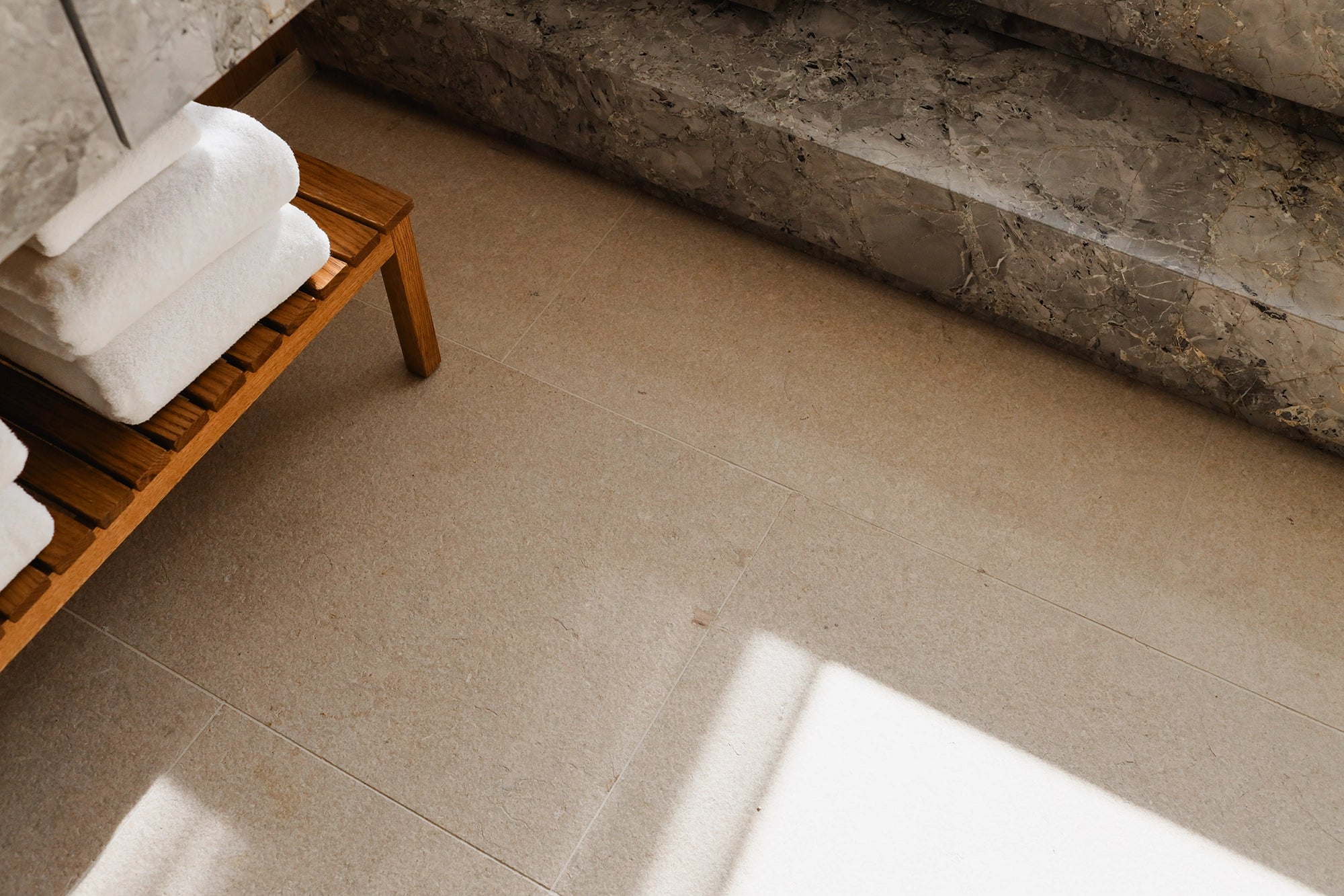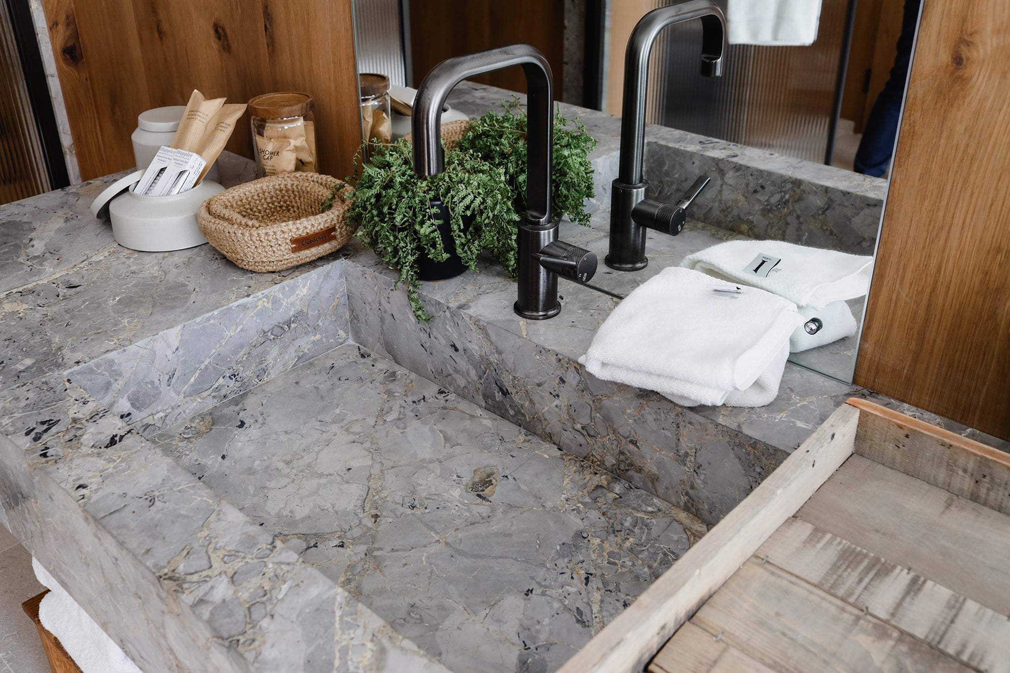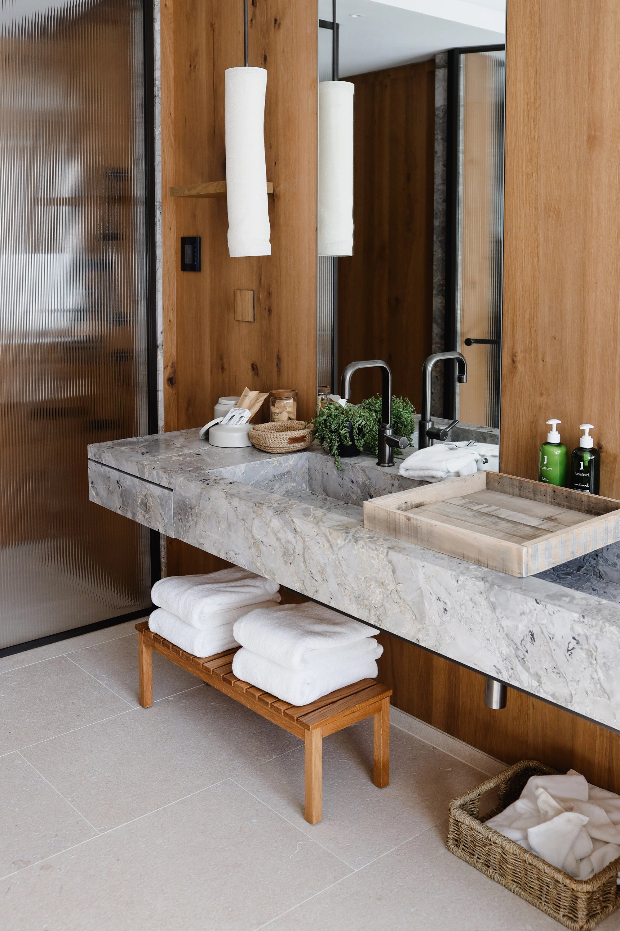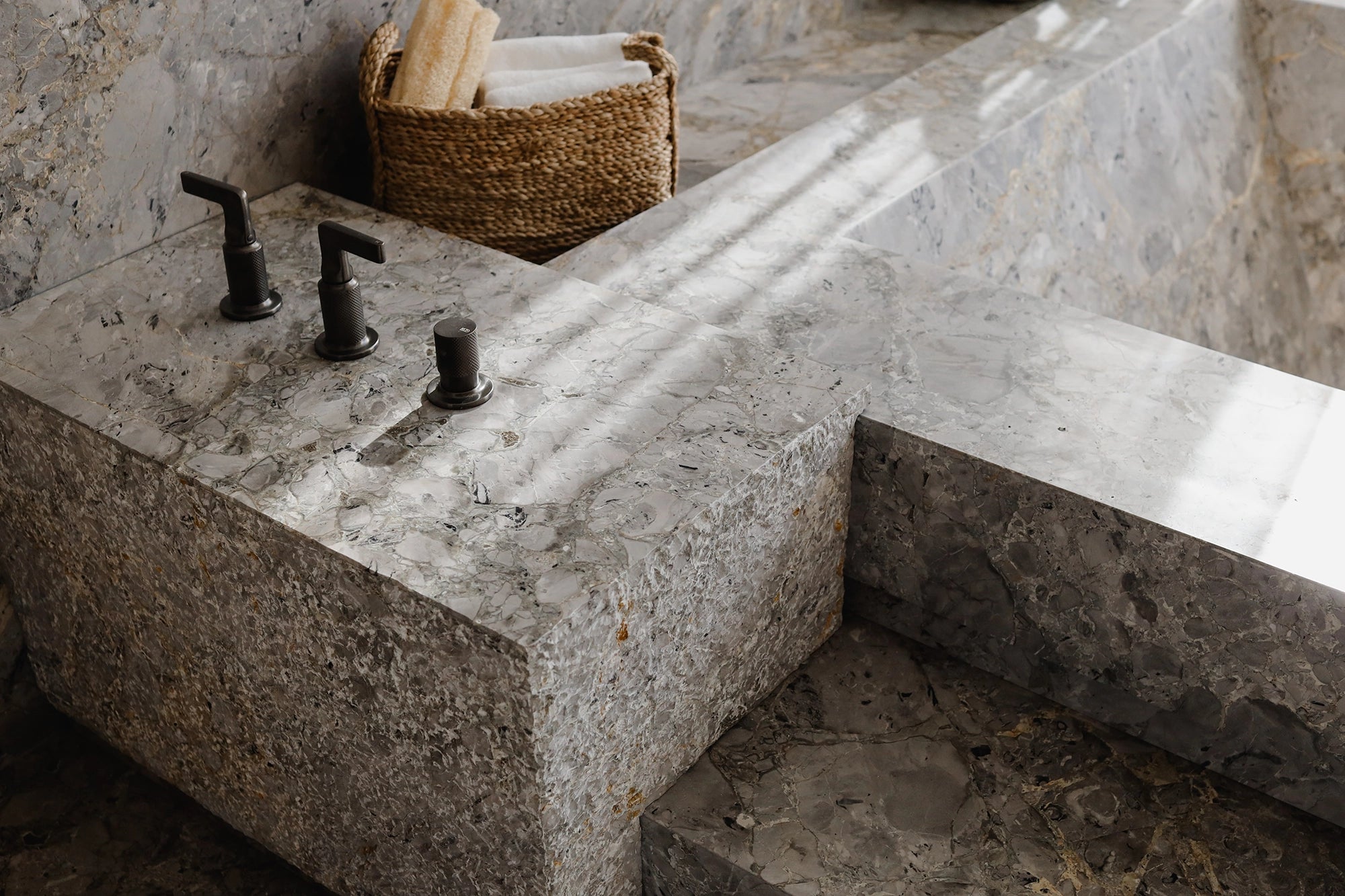 Slabs were honed for most wall elevations, floor and vanity top. We devised a special hand chiselled finish, for some small elevations including cladding to the bath. The bath itself was clad inside and out with Alpine Tiger as was the vanity basin. Flooring was Grolla flamed and brushed as per the rest of the bathrooms in the hotel.