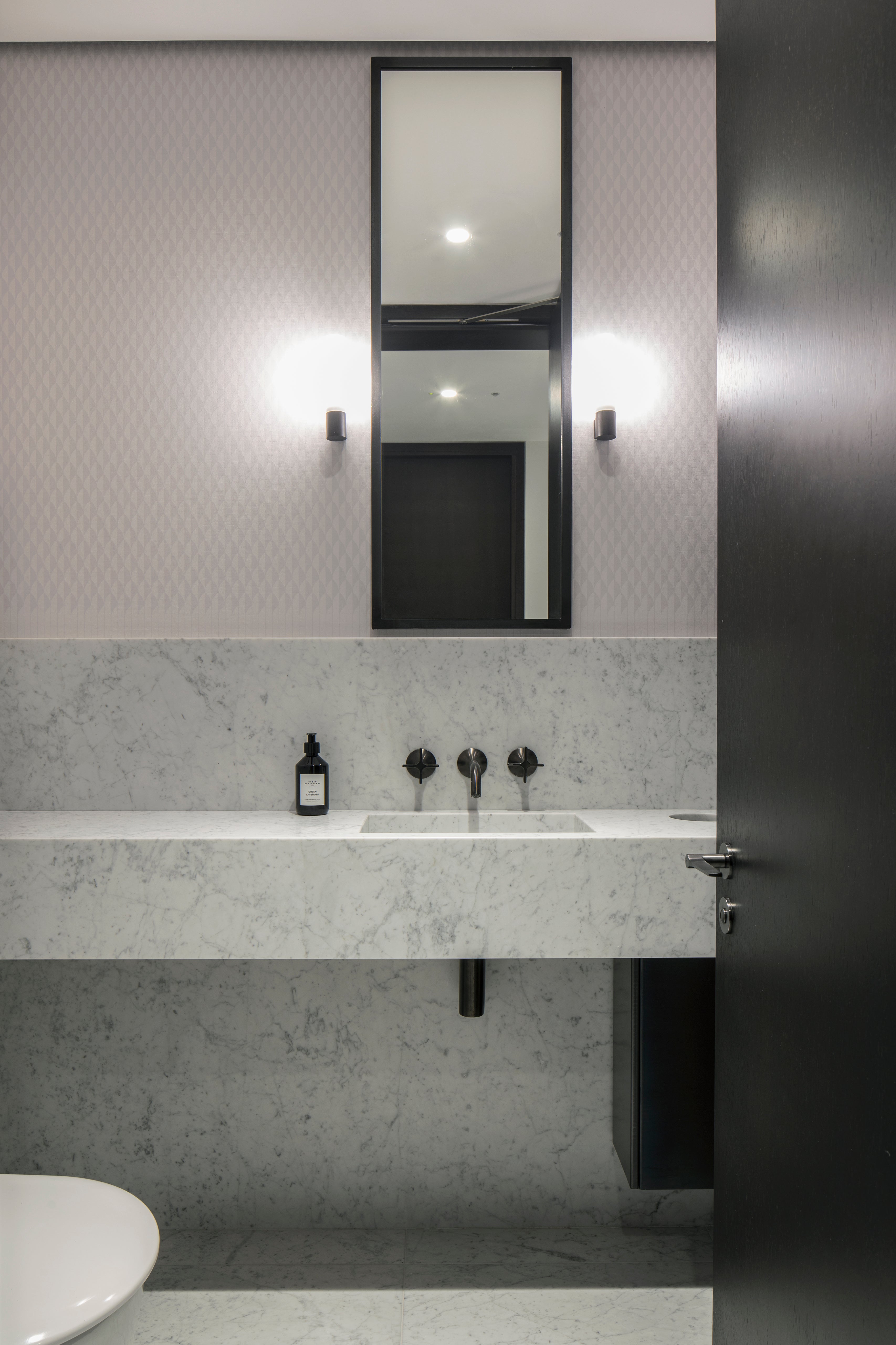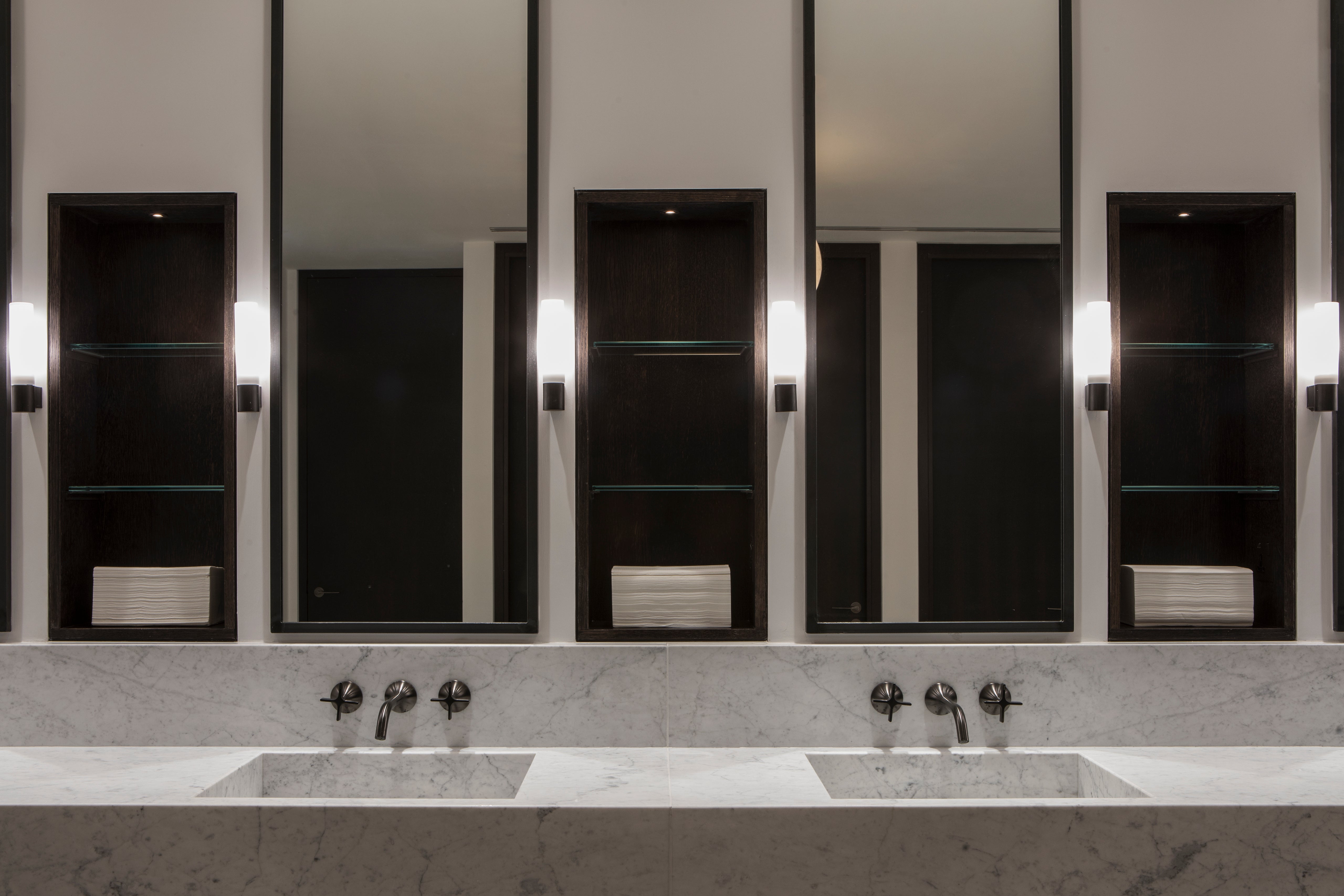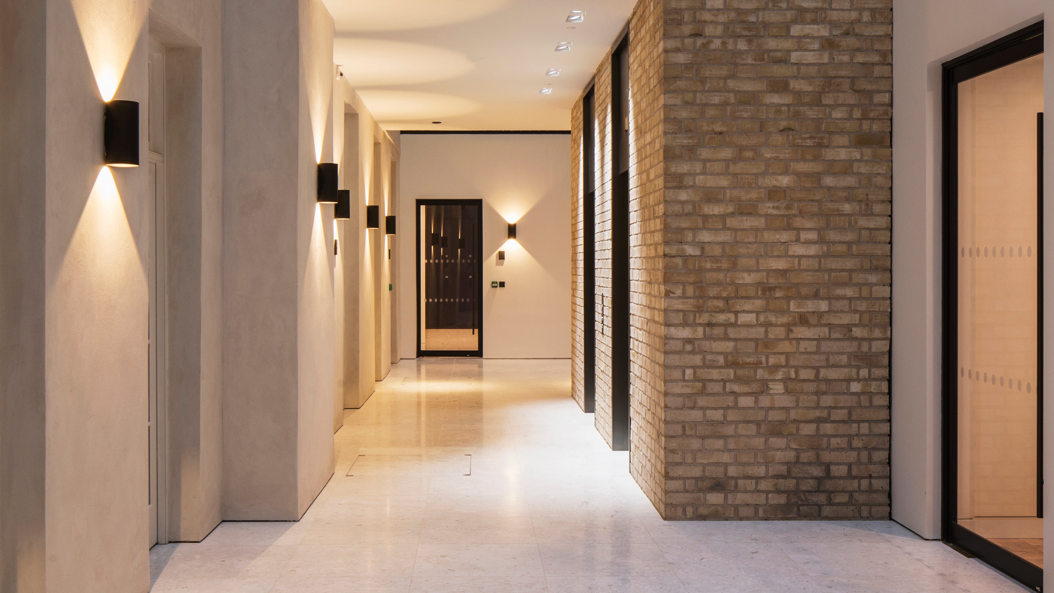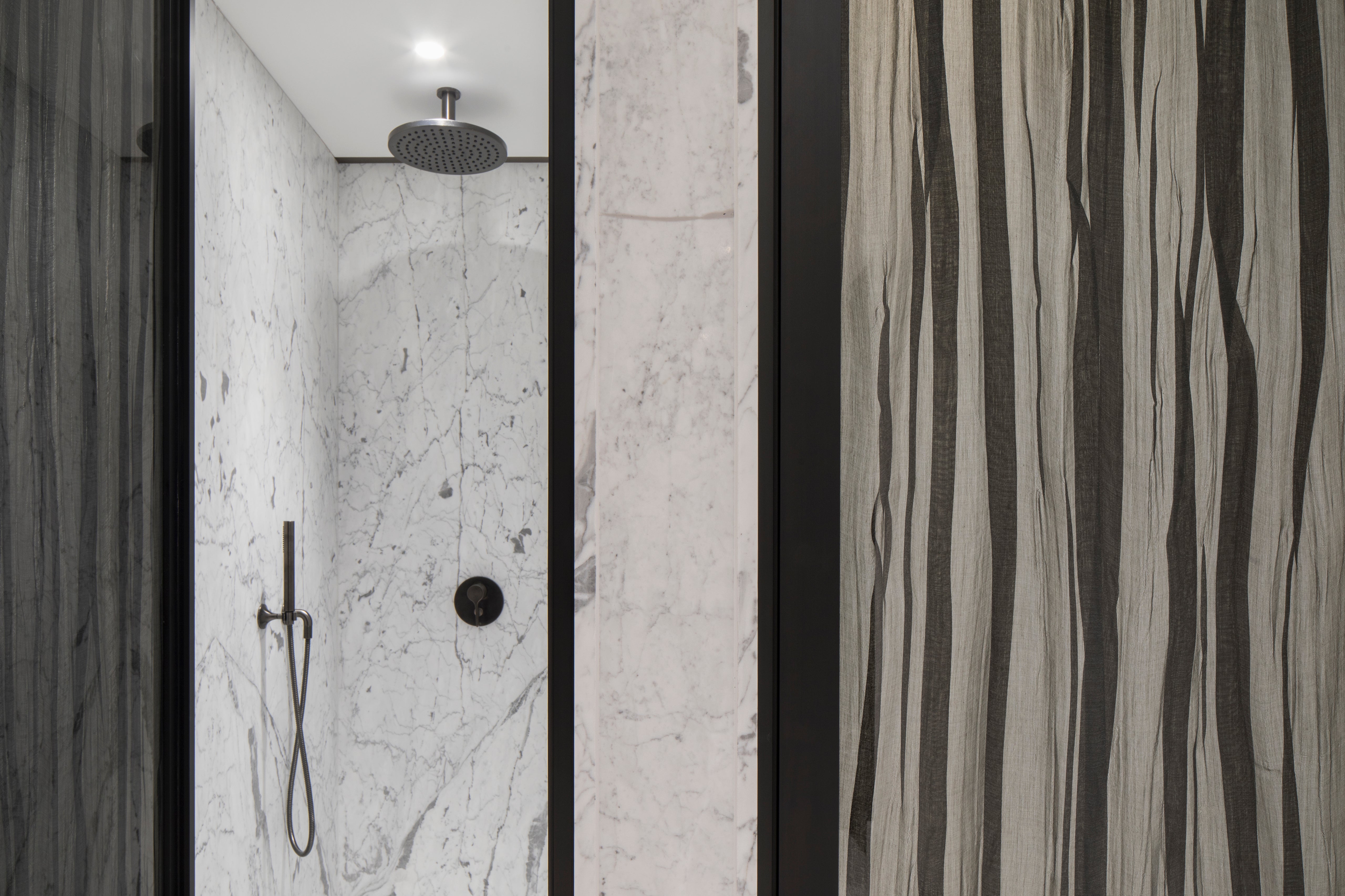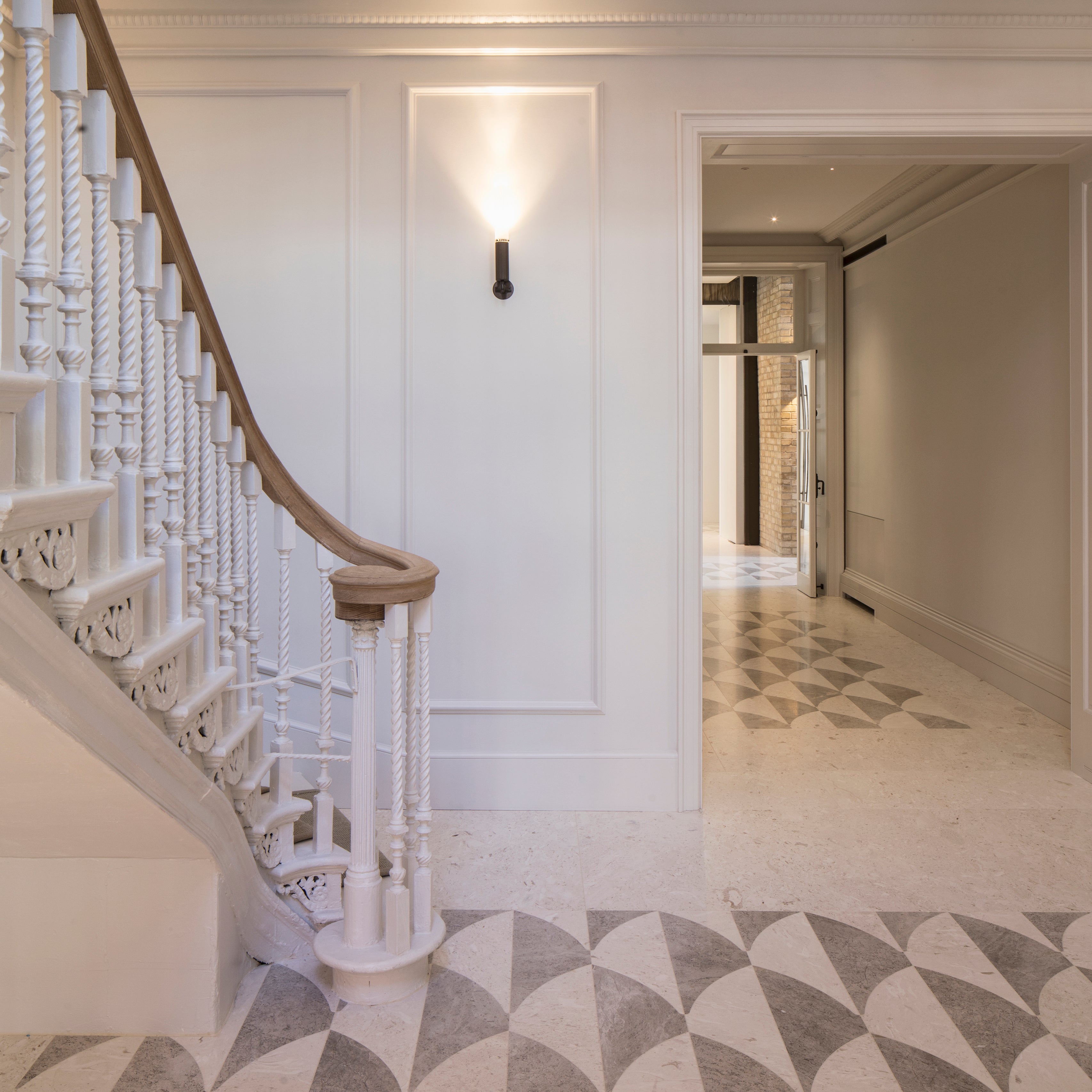 The centrepiece for us was most certainly the beautiful waterjet cut pattern of Crema Perla and Alpine White. Nick and Lucy wanted to create a floor that wasn’t the familiar chequerboard pattern or angular geometries, something more modern that could flow from the historic areas into the new. The building was famous in the mid-nineteenth century as a silk merchant and silk dressmaker’s business so we looked at woven patterns that have a flow. As the house was built in 1723 by a learned classical architect they also looked to Ancient Rome and the mosaic floors in the Baths of Caracalla. They also thought of the spears that you find on railings in Mayfair because the pattern needed to tie in with the metalwork on the project.