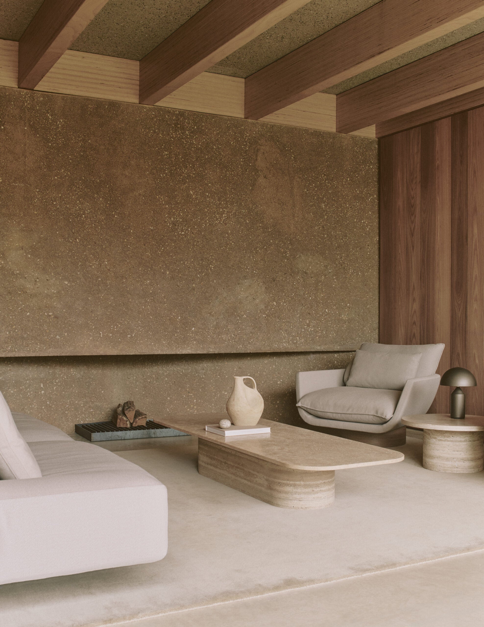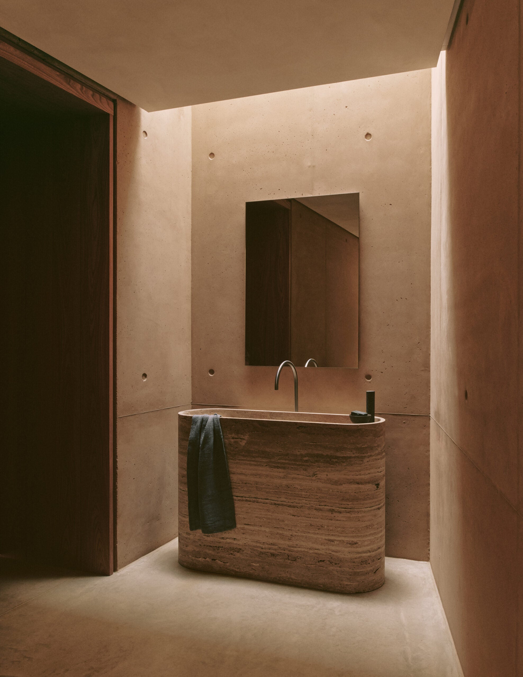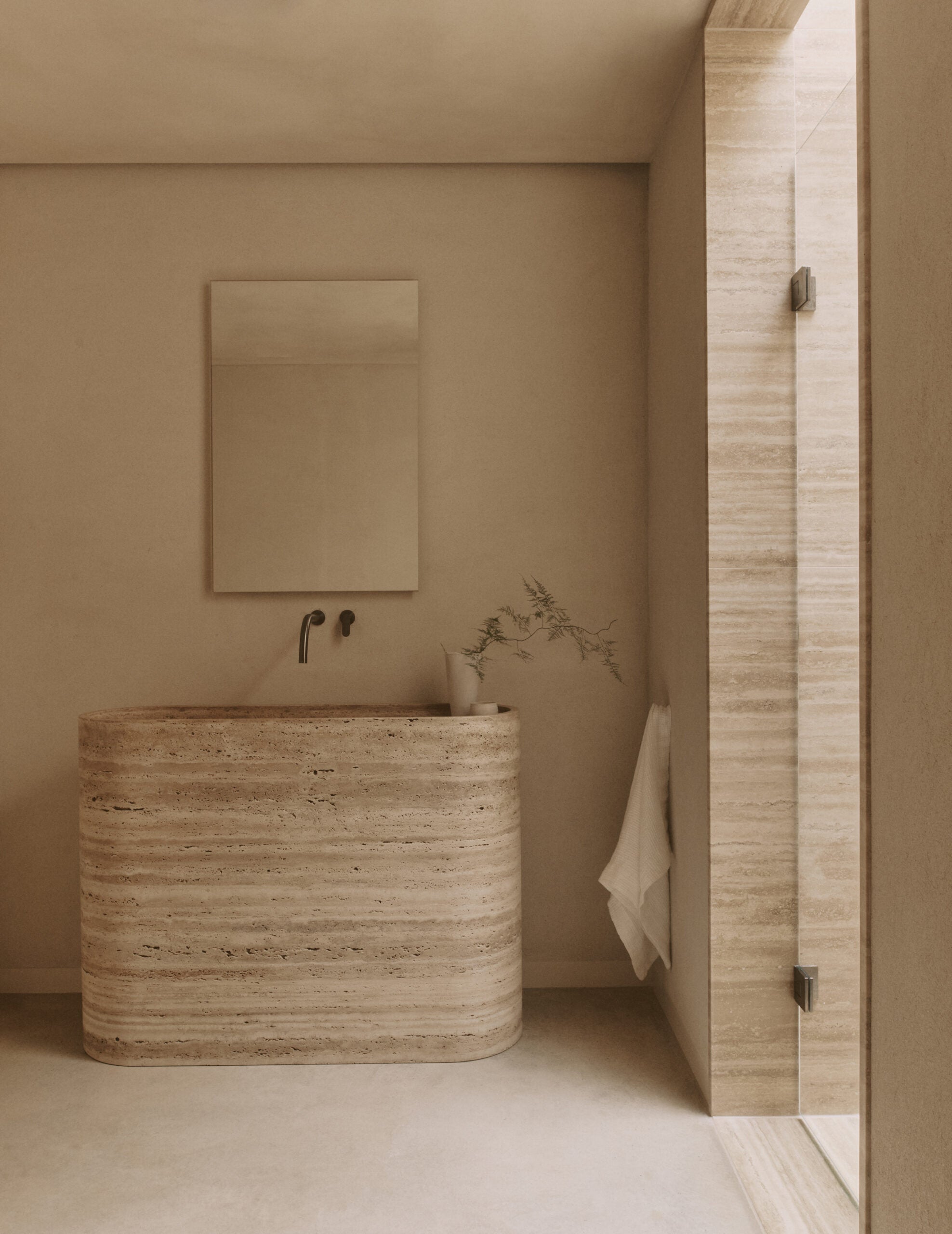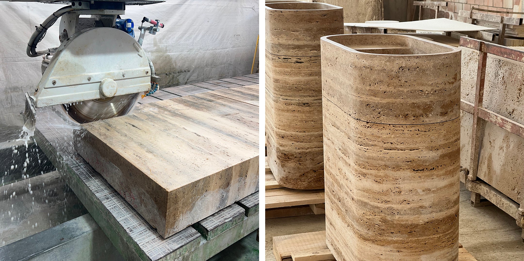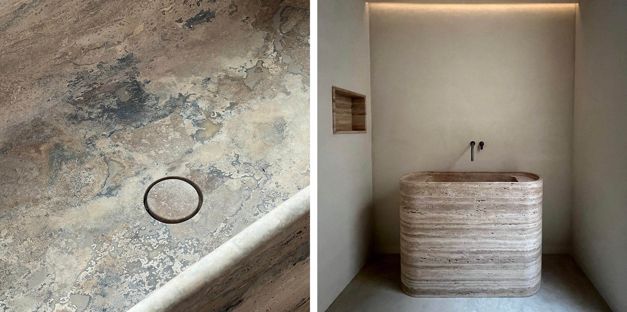The search started with a red travertine, from Iran but ended in Italy when one of our travertine specialists suggested a specific bench of a type of Noce Travertine from a quarry in Tivoli. In addition to the colour, we were to also try to find a travertine with very defined banding and this box was well and truly ticked by the chosen material with colours from cream to black as well as essential earthy browns.
