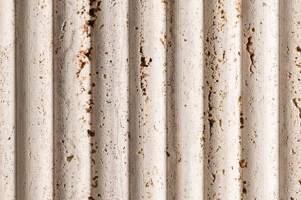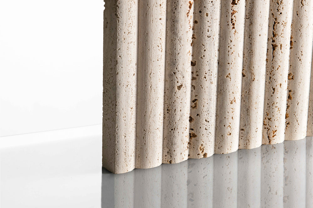 Bianco Di Carlo is an exquisite travertine, light white creamy base, then grey, brown, beige and rusty bands of colour its very much of the moment. It is quite a unique blend, with a majority of travertines have beiger tones to start with, with nothing quite like the variety in the colour in the bands of strata running through it. With the finishes exhibiting heavy relief the surface is sawn as standard so bands of different colours are really subtle so Bianco Di Carlo really works well, just enough interest but not too much to clash with the form.