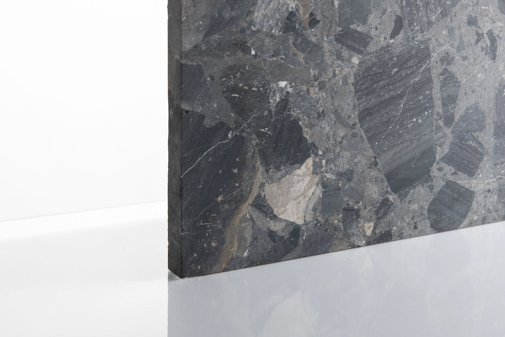 A really punchy combo of ruptured strata lines and tumbling boulders. Rich black, anthracite, warm greys and deep brown feature here, a real statement for any project. In honed it its intense features are highlighted, when bush hammered and brushed colours lighten and the features soften.