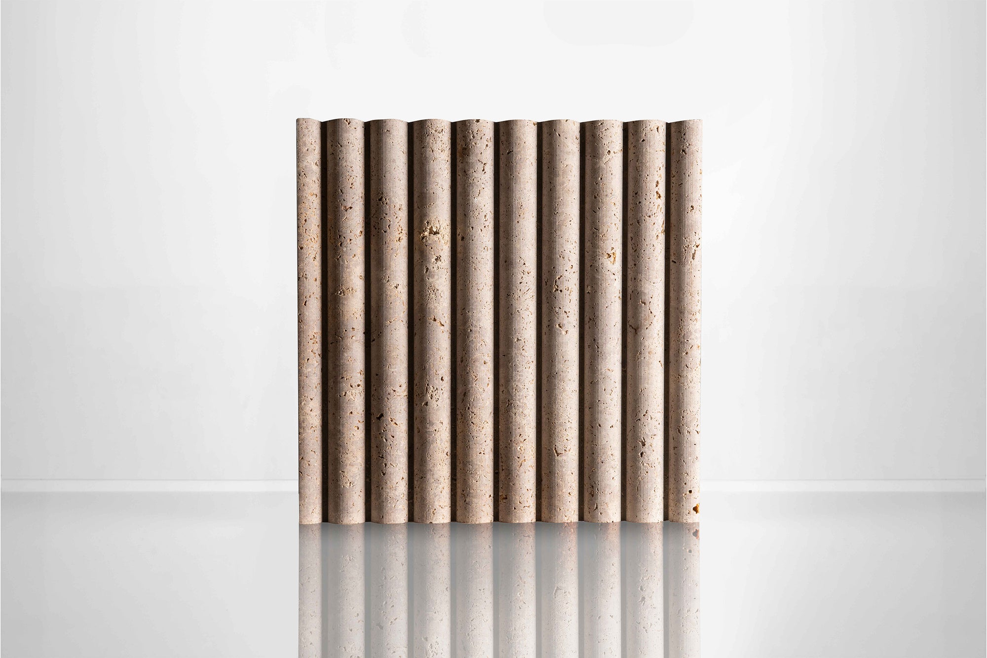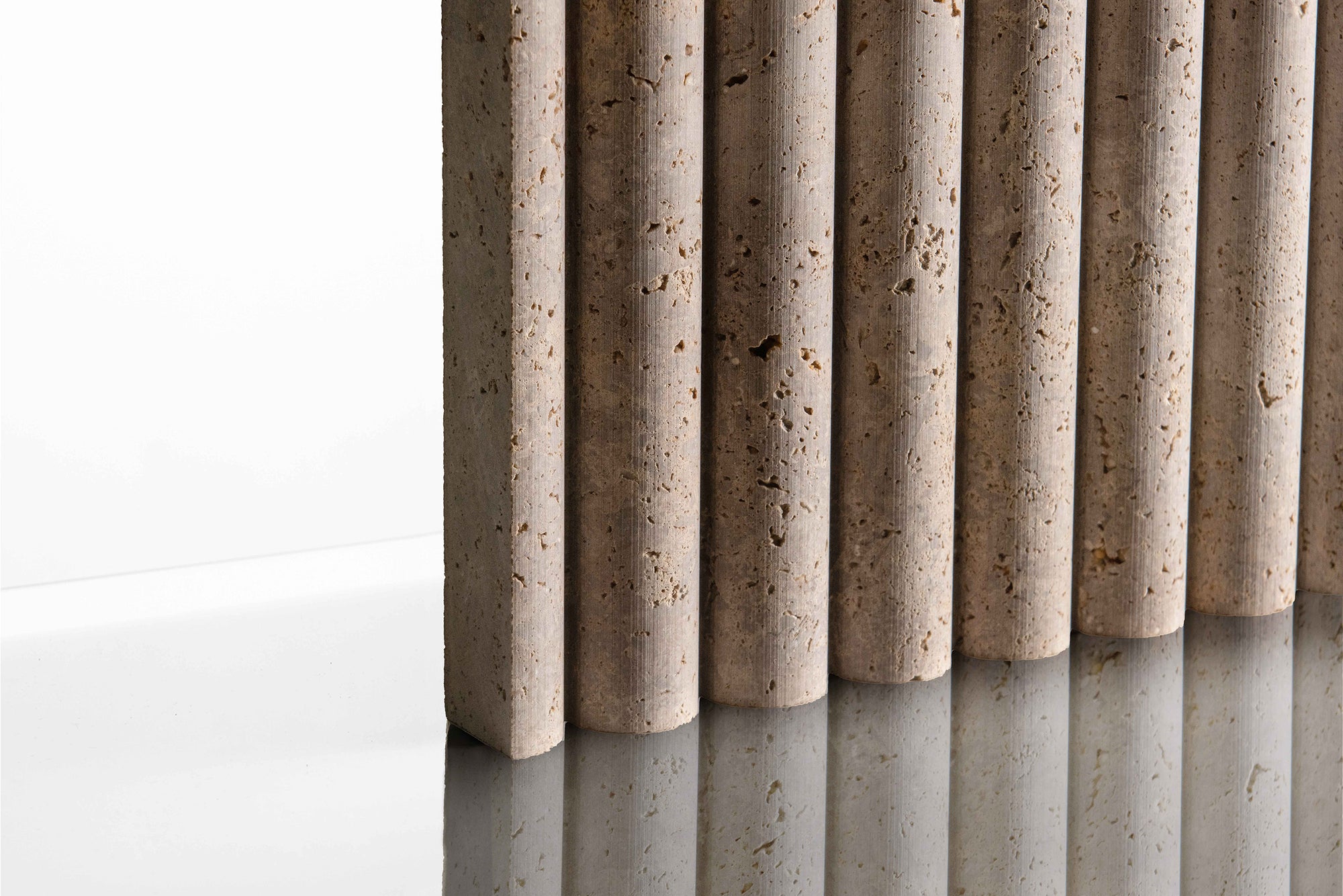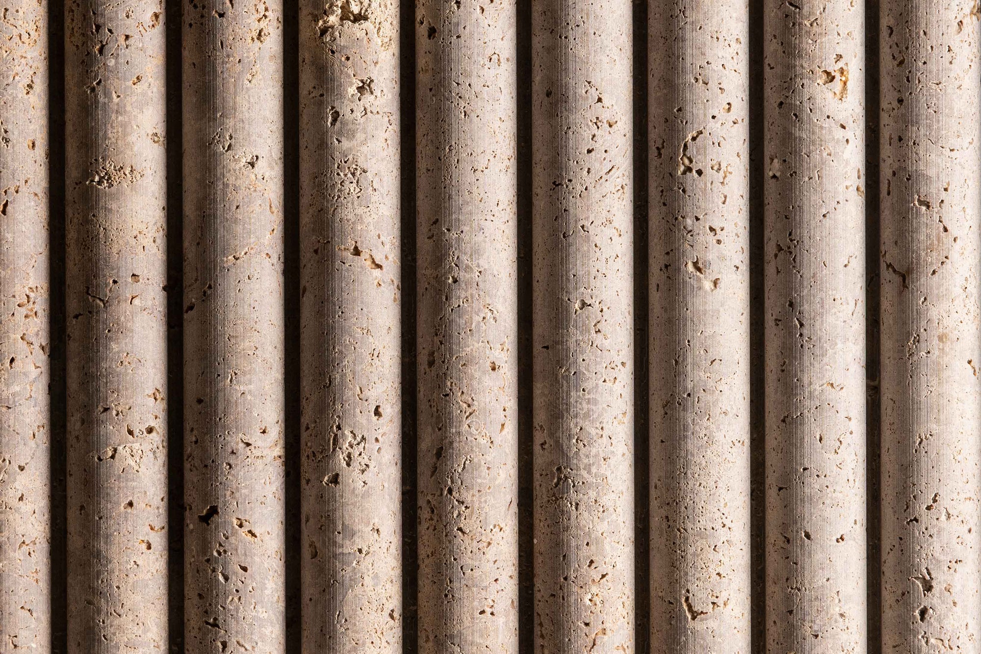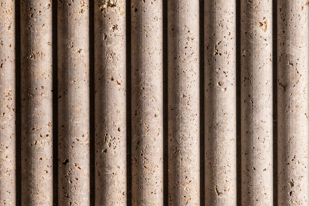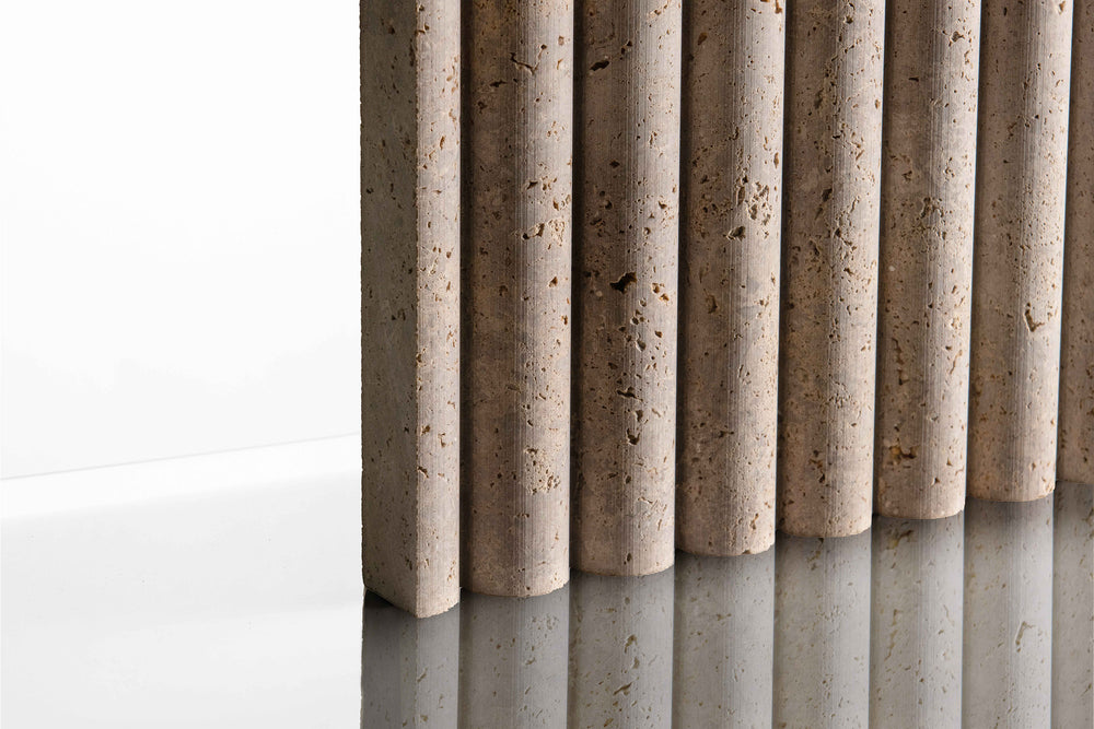 Black Noce is a very narrow bed in an Italian travertine quarry, only 400mm high, so all production is cross cut, with colour meandering between a cooler brown to warmer one. When seen in these nicely profiled reliefs, it's sawn and the shade and colour make it a great base travertine for these eye catching finishes.