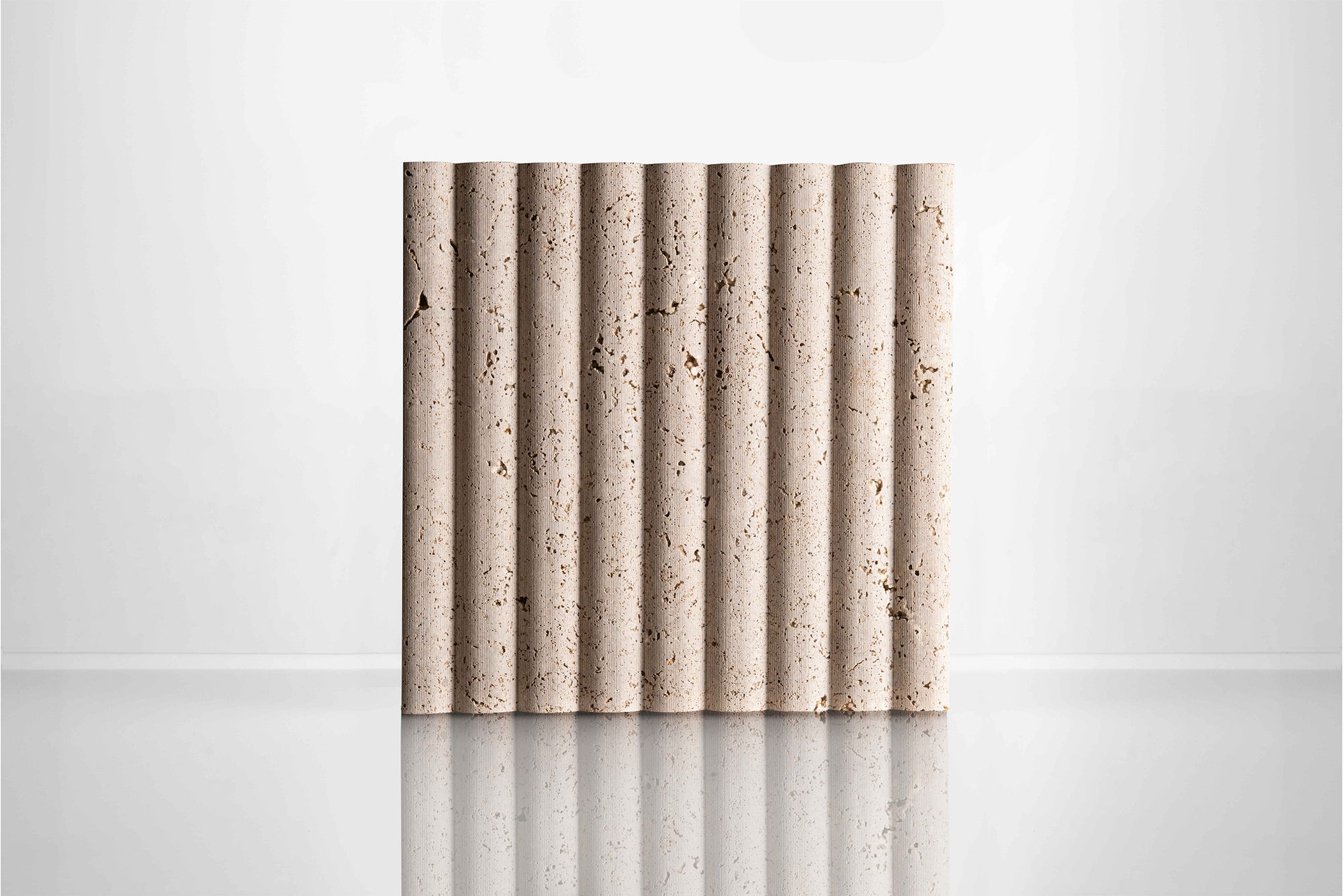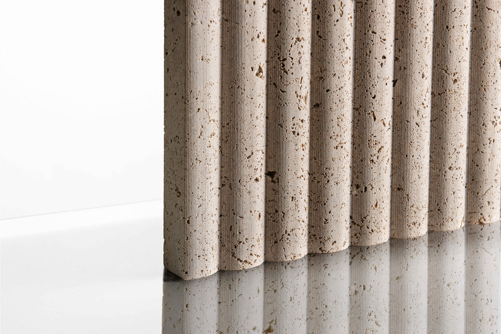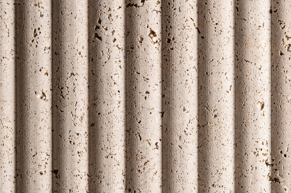 Black Noce is a very narrow bed in an Italian travertine quarry, only 400mm high, so all production is cross cut, with colour meandering between a cooler brown to warmer one. When seen in these nicely profiled reliefs, it's sawn and the shade and colour make it a great base travertine for these eye catching finishes.