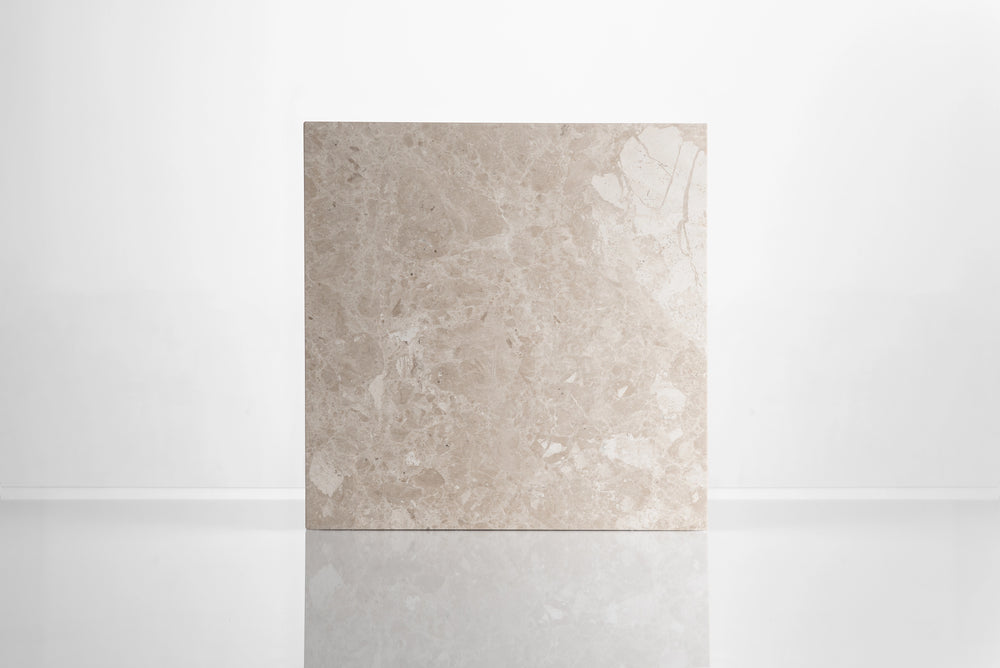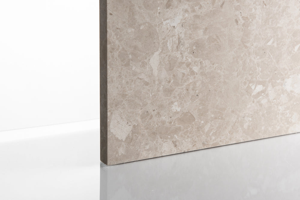 Toffee, caramel, with lighter veins, patches and inclusions giving brecciated appearance. Consistent base colour, extremely hard limestone, and a cost effective choice. We have slabs in stock, ready to bespoke interior applications.