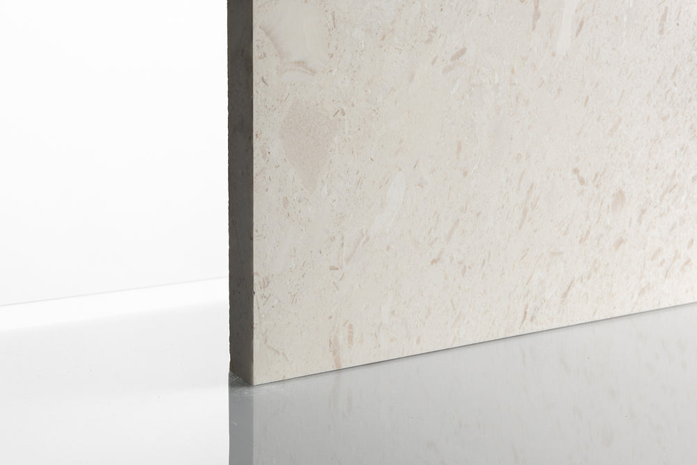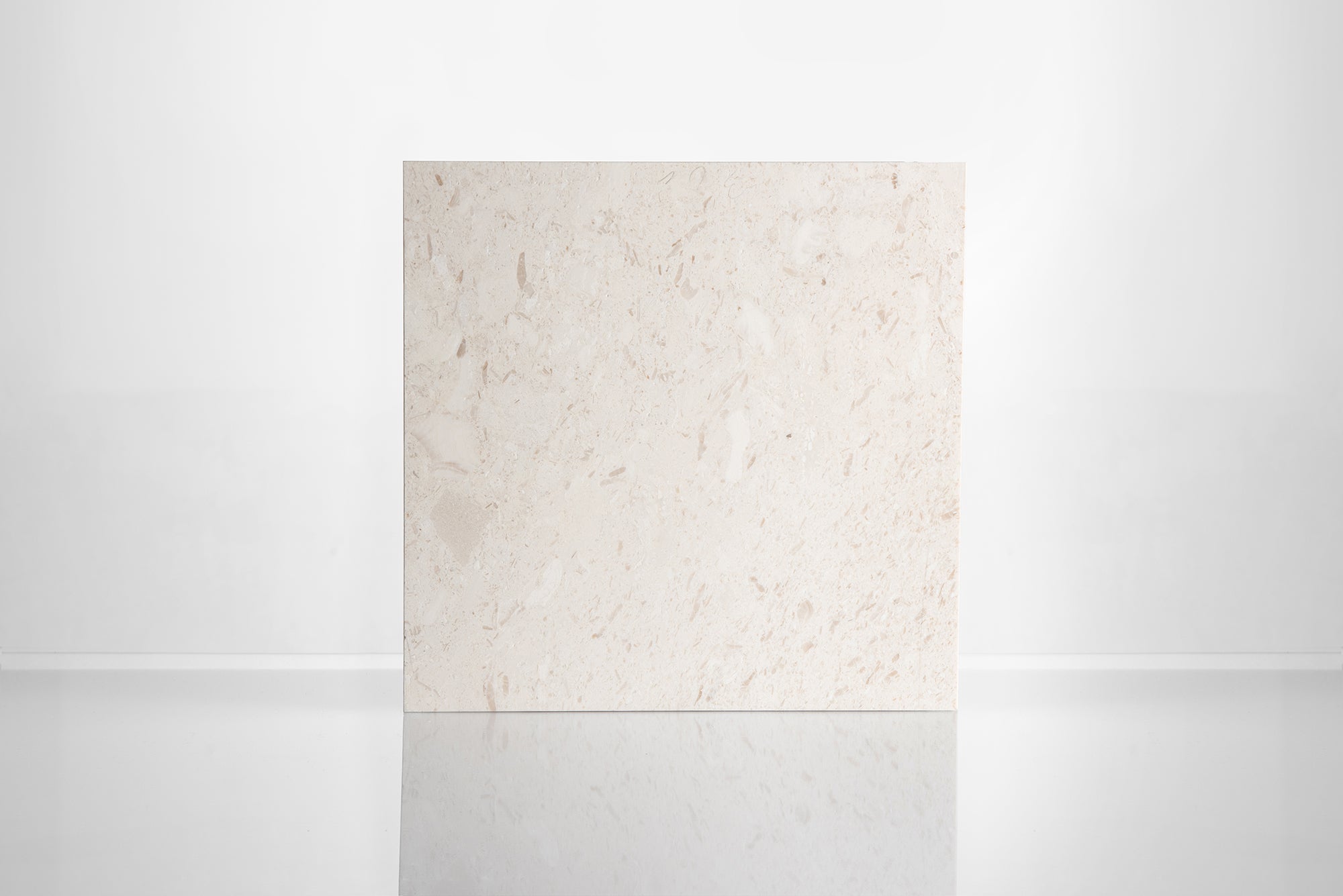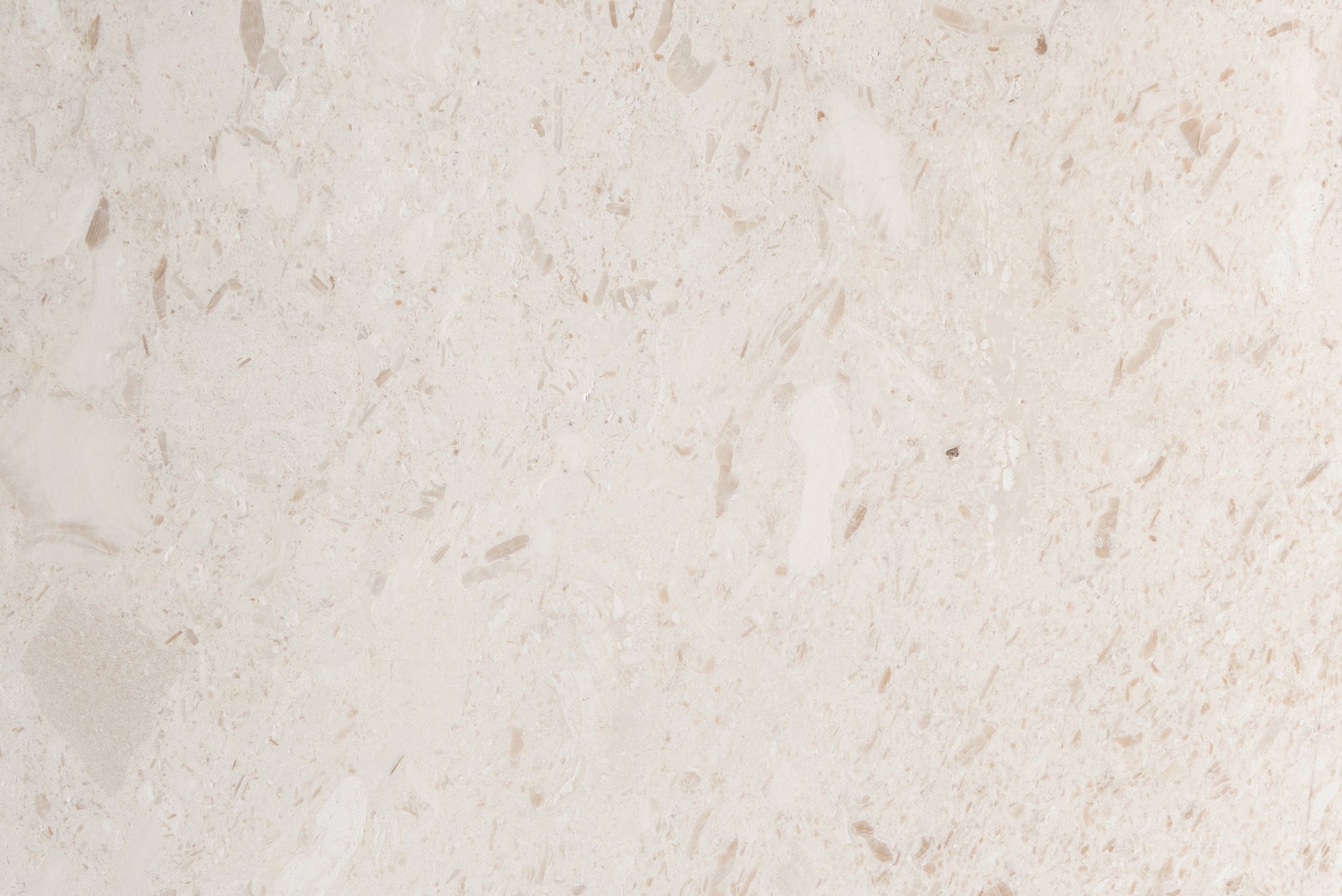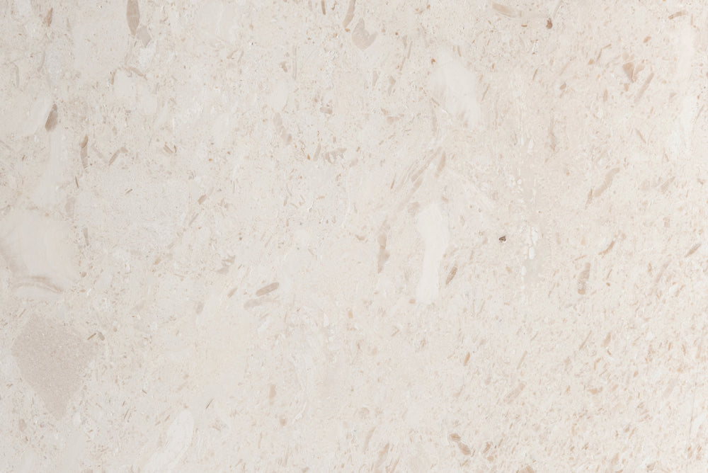 A hard creamy white limestone with grey, cream, yellow and black fossils and shells throughout.